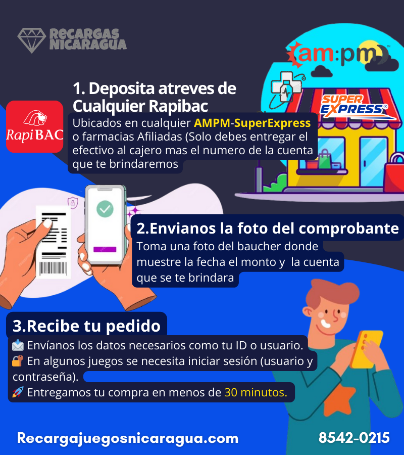 🏦 Puedes realizar tu depósito a través de cualquier Rapibac a nuestra cuenta BAC en córdobas. La información de la cuenta te la brindamos por WhatsApp al momento de la compra.